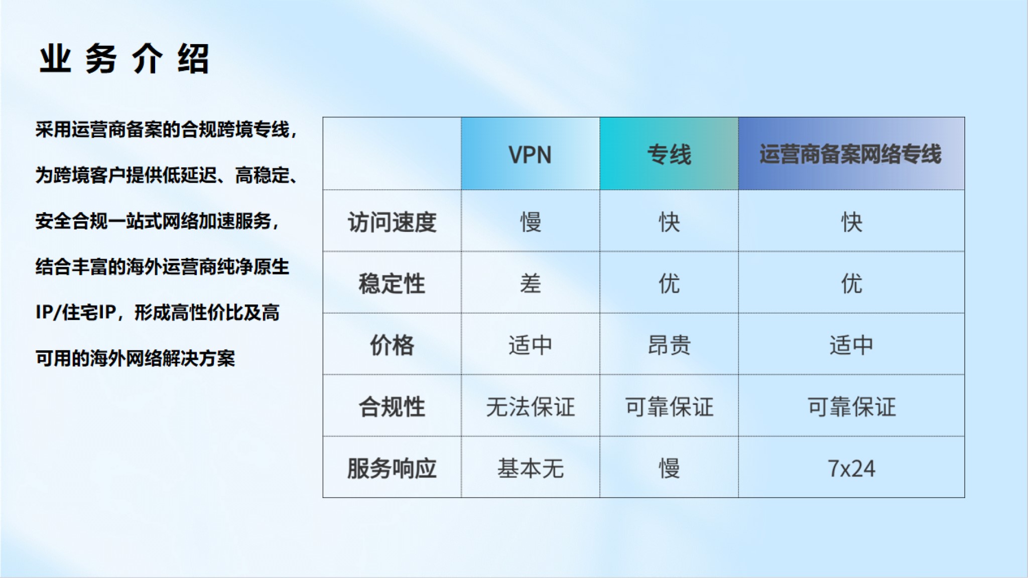 從線路申請(qǐng)、路由優(yōu)化到維護(hù),提供一站式專業(yè)服務(wù),一對(duì)一解決問題,專業(yè)營銷團(tuán)隊(duì)一對(duì)一定制服務(wù)